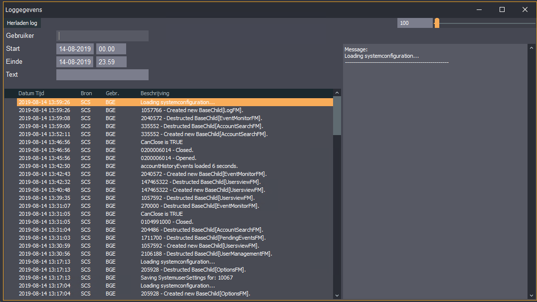 In het scherm loggegevens kunnen foutmeldingen teruggehaald worden binnen het SECONTS systeem.