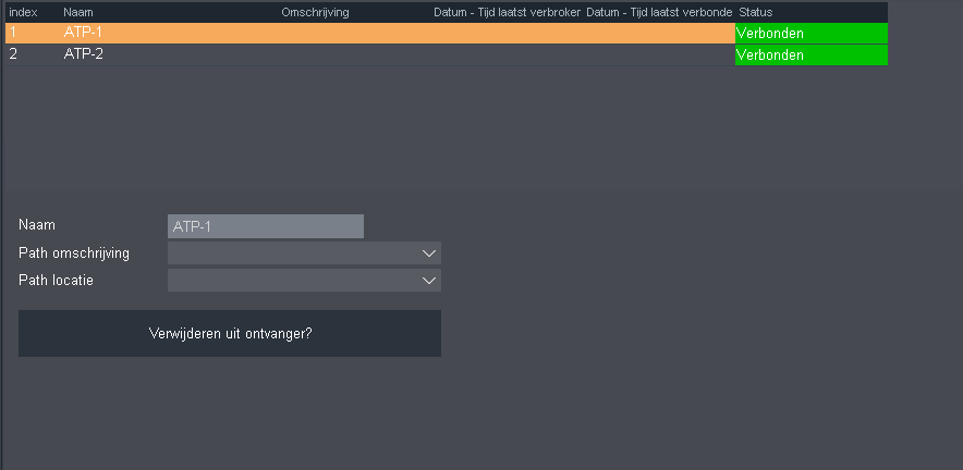 de eerste regel te zien. Dit is de kwalificatie voor het transmissie systeem zoals het wordt toegepast voor de geselecteerde klant. Onder de ATS zijn de ATP’s (Alarm Transmission